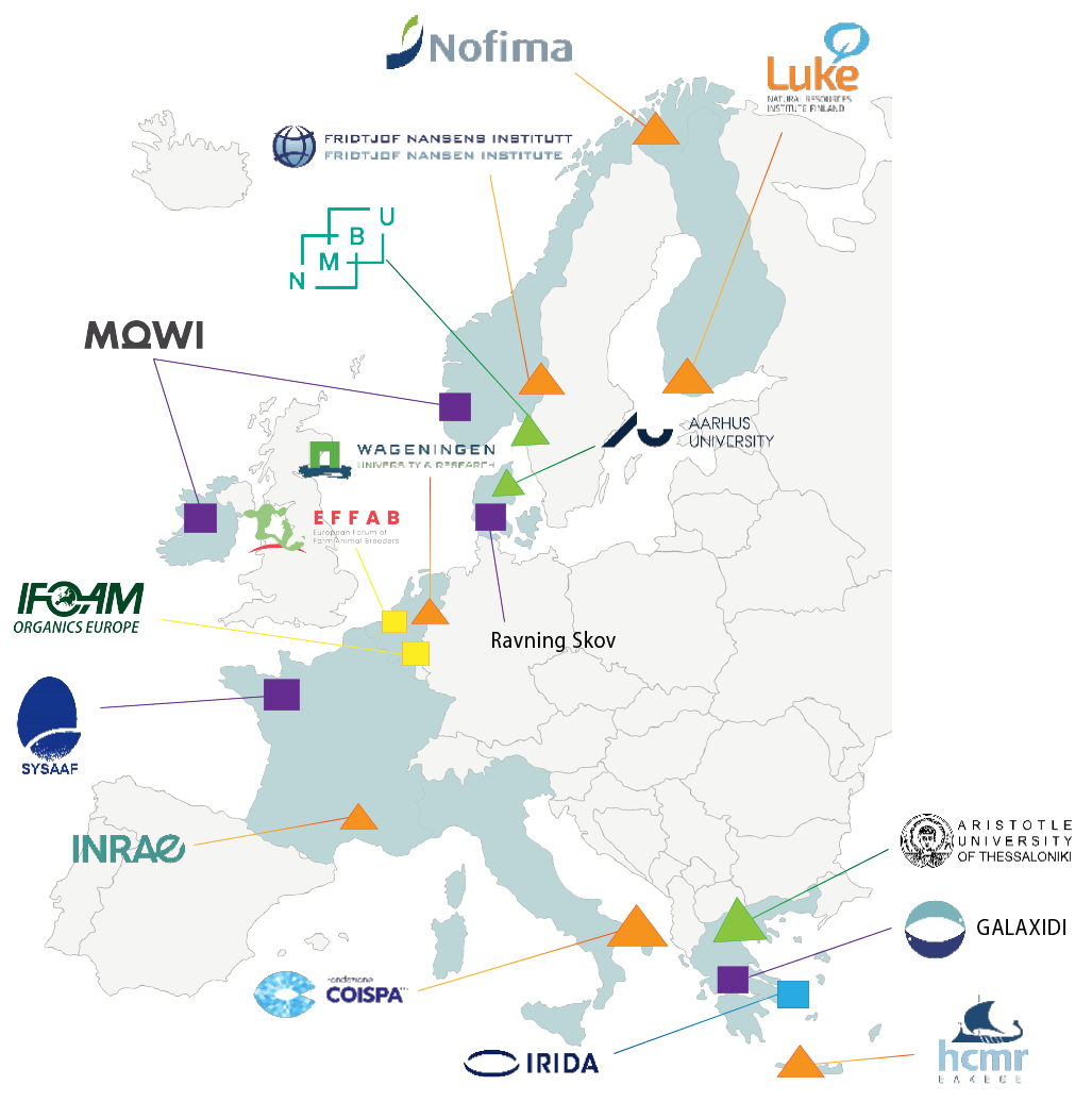 The partnership includes 10 research and higher education institutions, complemented by key actors from the organic sector, fish farming companies, and feed producers. Together, they provide access to a wide range of facilities, breeding populations, and experimental environments essential for advancing selective breeding in organic aquaculture.
